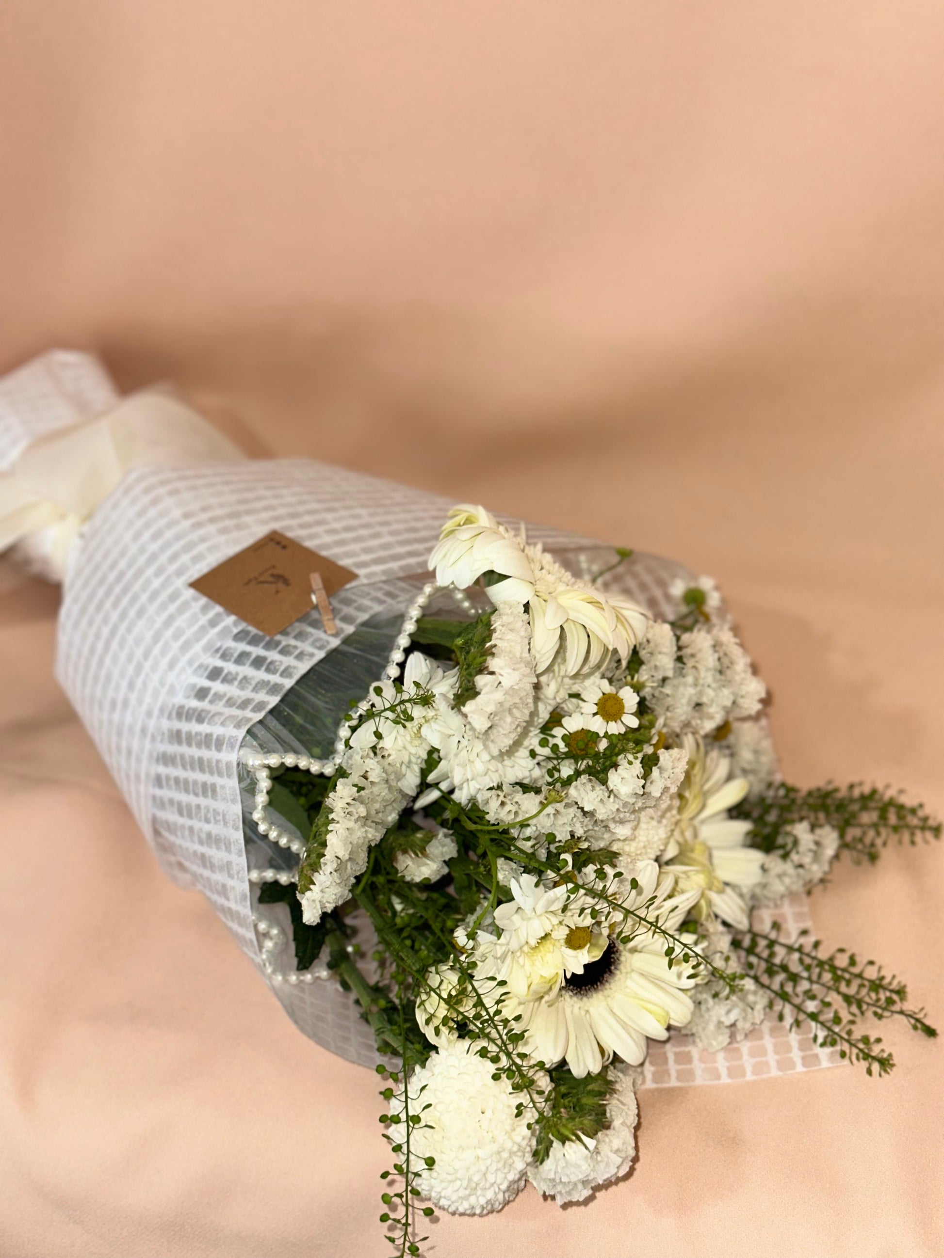 White Pom Pom (2 Stalks), White Gerbera (3 Stems), White Statice ( 1 Stalk), Chamomile (1 Stalk), White Ping Pong (2 Stems), Oxpetalum Blue (3 Stems)