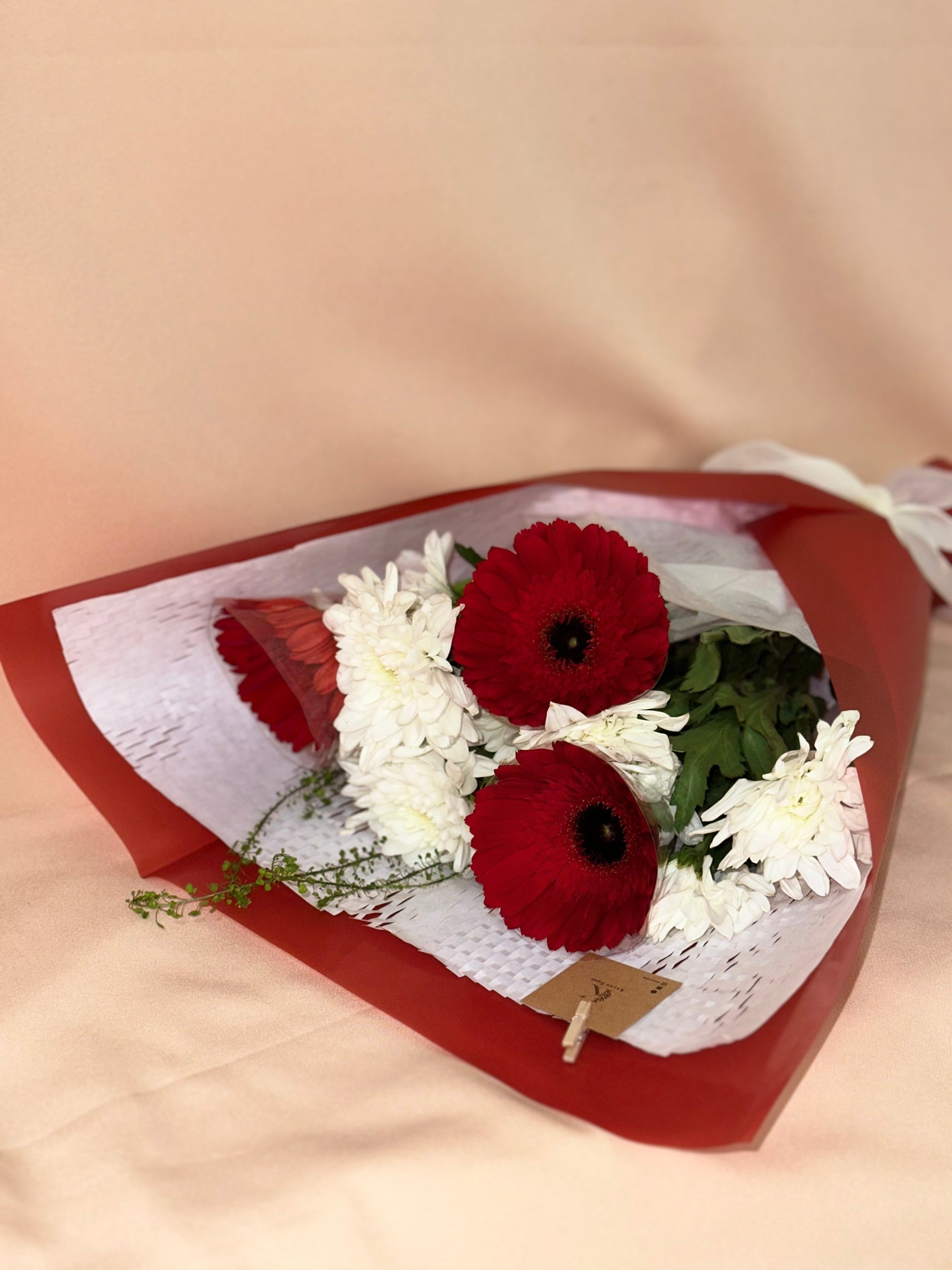 White Pom Pom (2 Stalks), Red Gerbera (3 Stems)