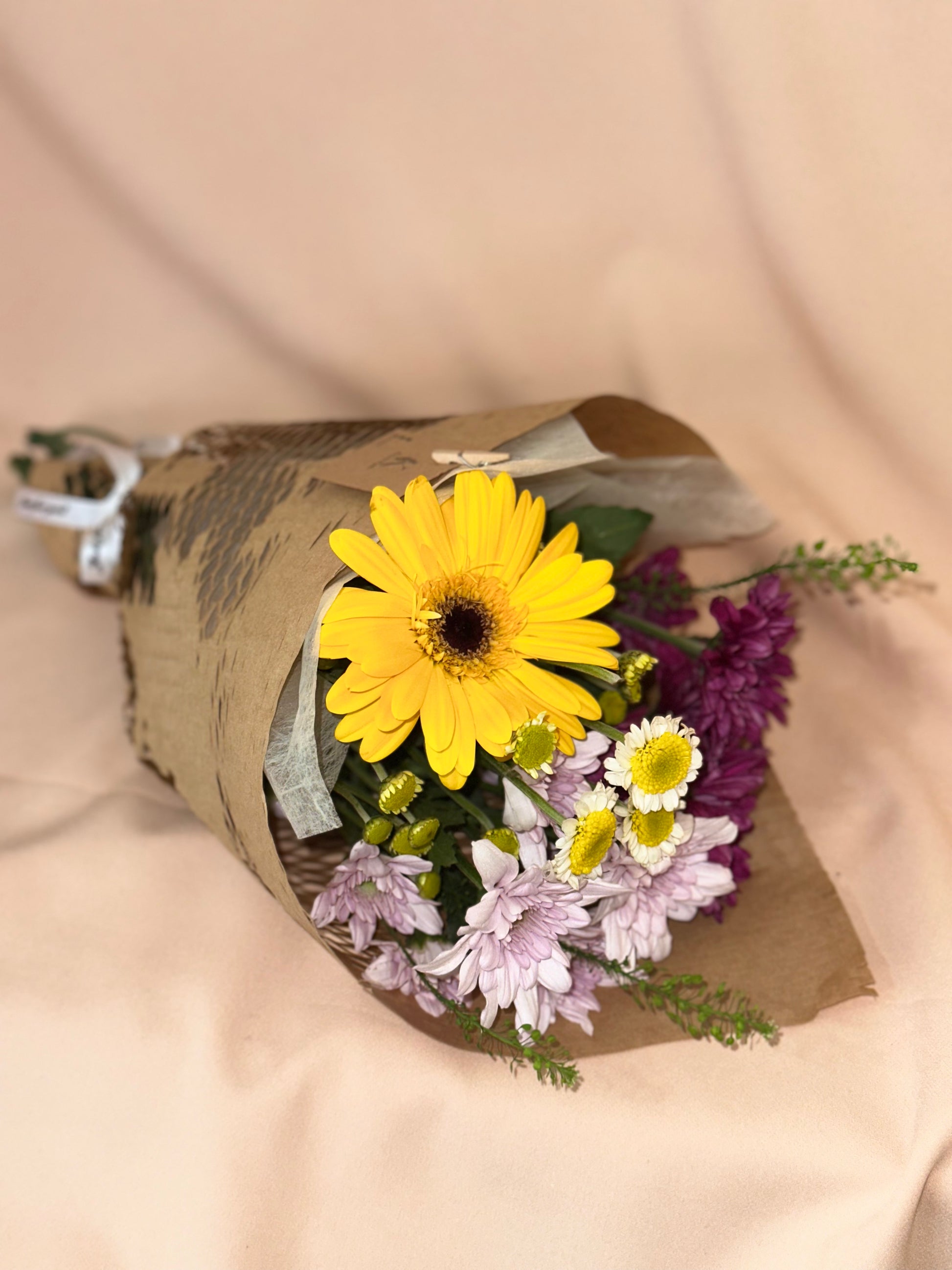 Bouquet Bayu exudes simplicity and charm, featuring a delightful blend of purple pom pom flowers and yellow Gerbera daisies, lovingly wrapped in honeycomb paper.