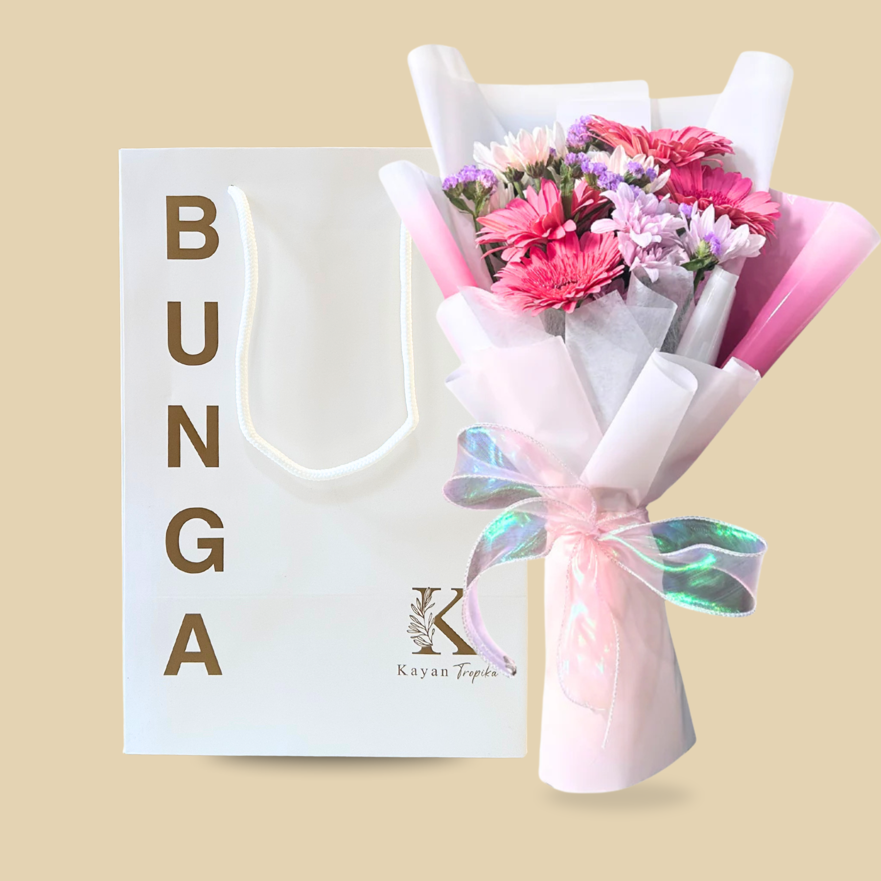 White Pom Pom (1 Stalk), Hot Pink Gerbera (4 Stems), Light Purple Pom Pom(1 Stalk), Purple Statice (2 Stalks).