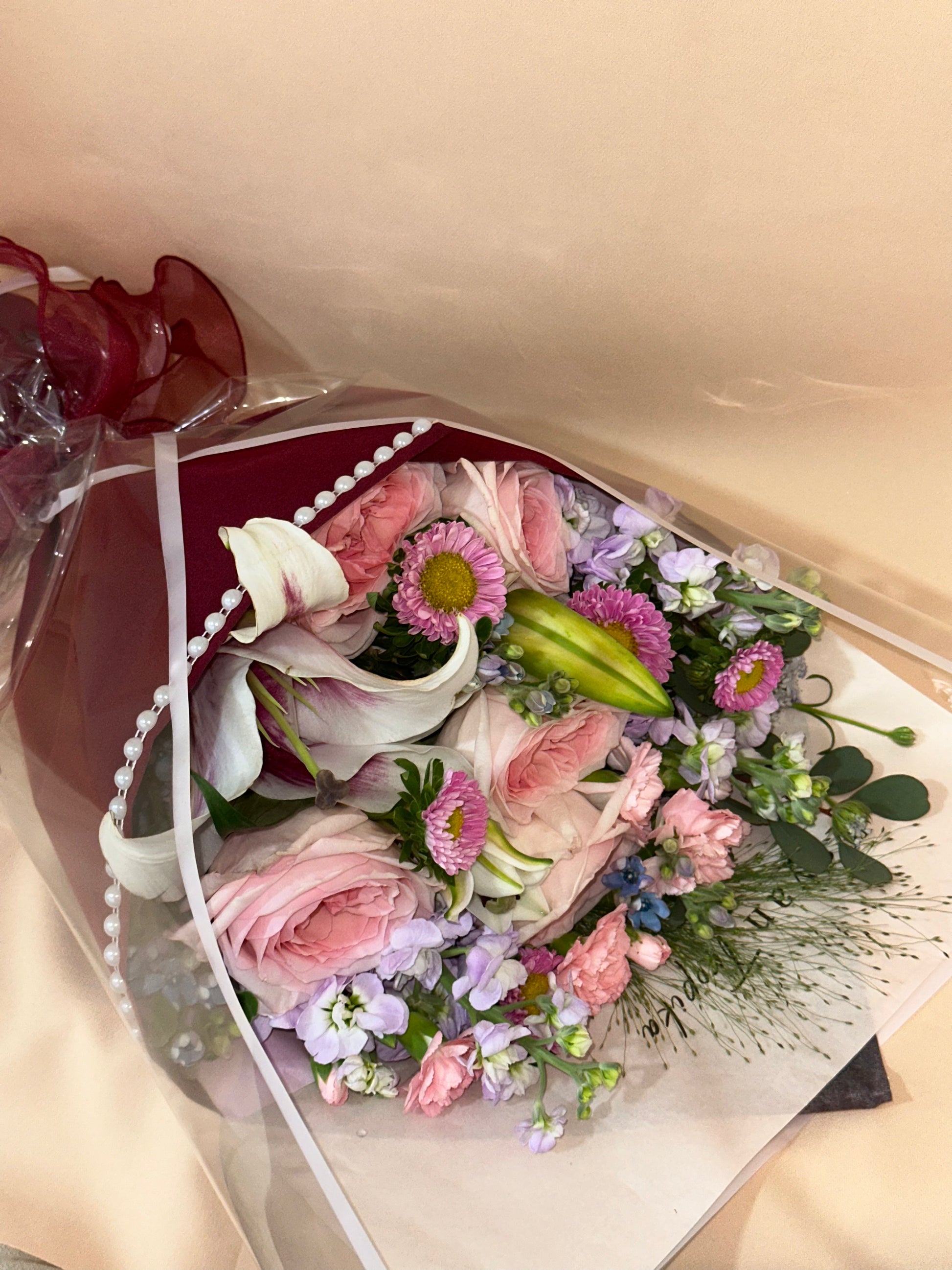 Aster Flower (1 Stalk), Pink Rose ( 5 Stems), Pink Lily (1 Stem), Matthiola ( 2 Stems),Pink Carnation ( 3 Stems), Fountain Grass ( 1 Stem), Oxpetalum Blue (3 Stems)