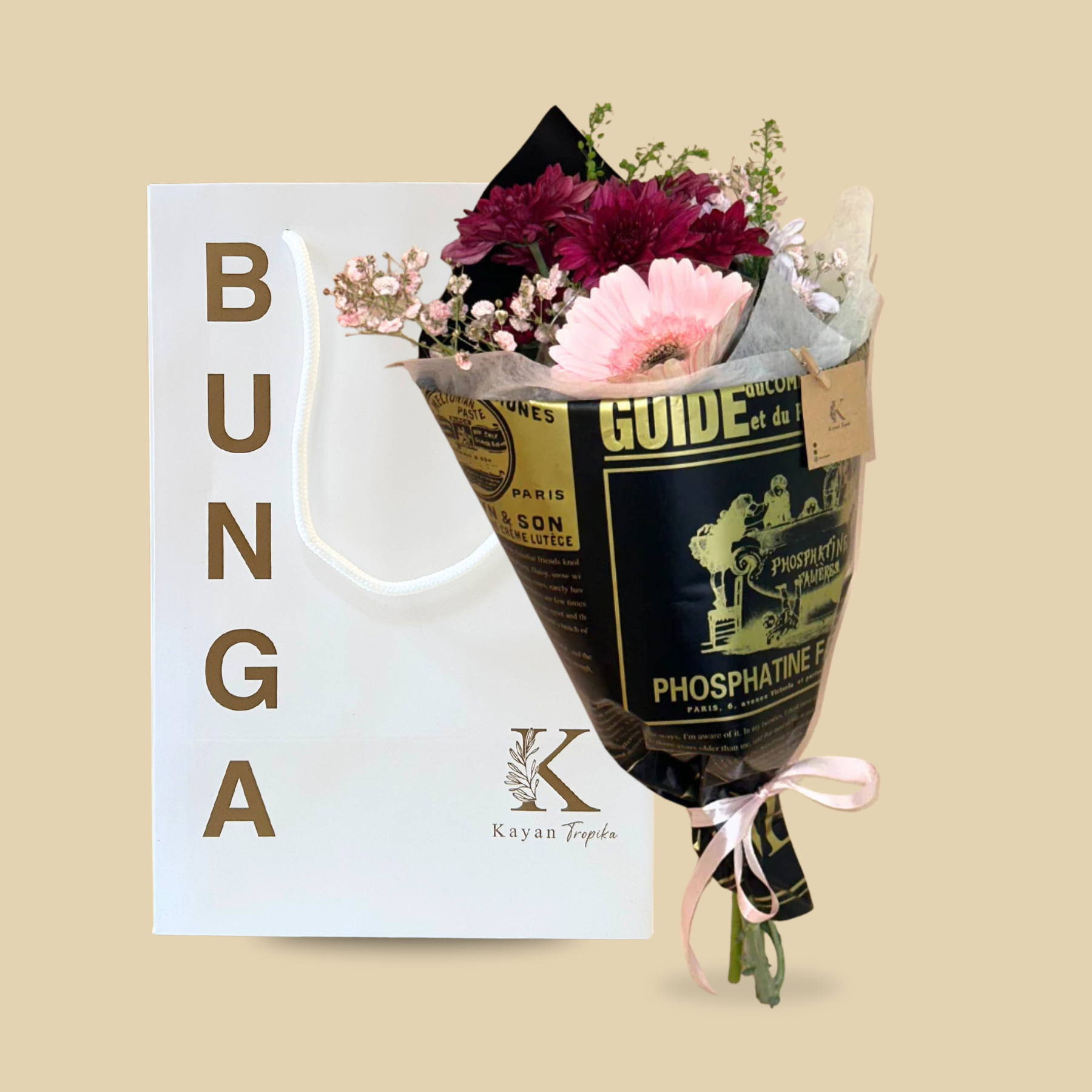 The "Elegant Charm Bouquet" features a stunning combination of flowers: one stalk each of light purple pom pom, white pom pom, hot pink gerbera, and light pink gerbera, accented by a stalk of light pink baby’s breath. Wrapped in sophisticated vintage black newspaper, this bouquet exudes a classic and refined aesthetic, making it a perfect choice for expressing love, gratitude, or celebration!
