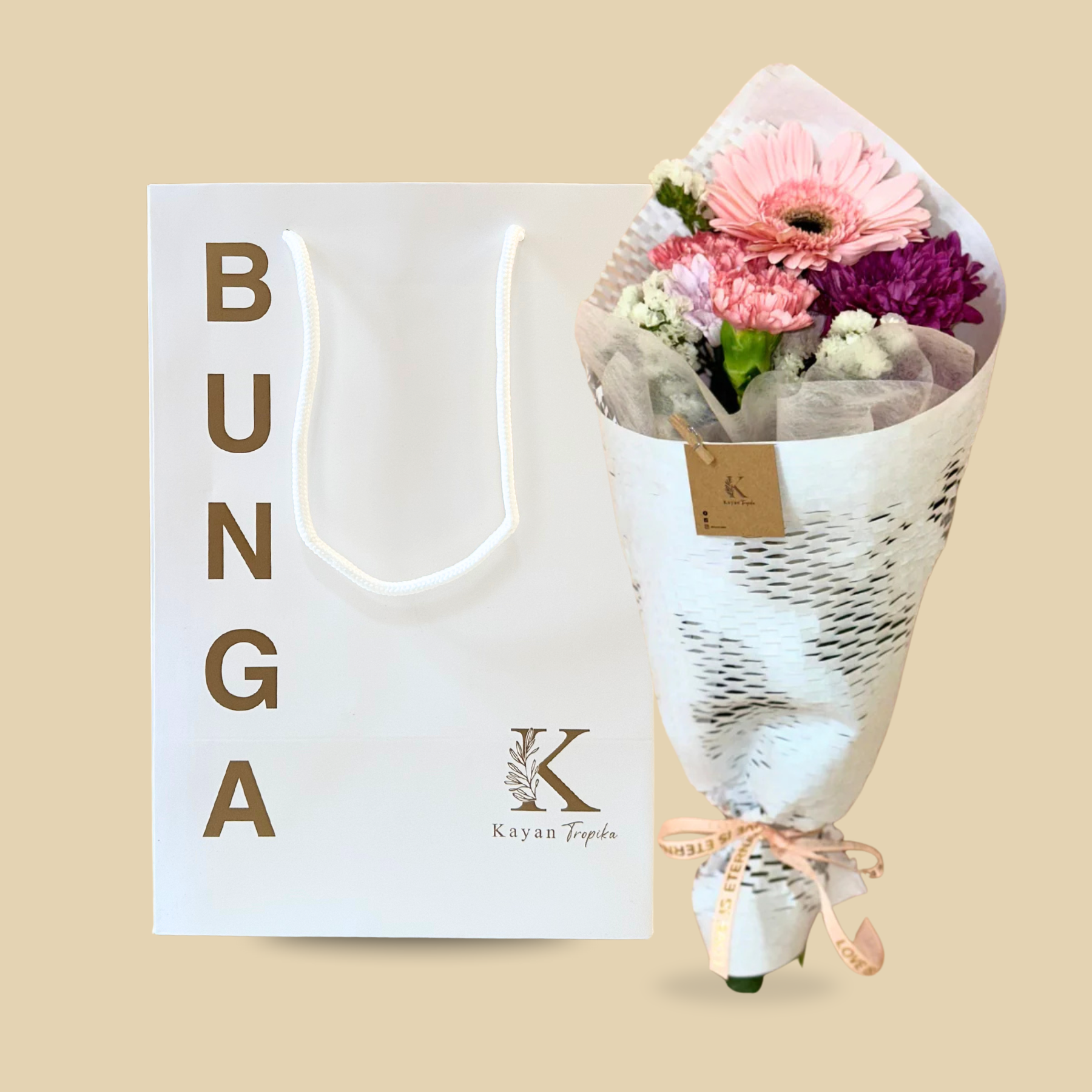 Purple Pom Pom (1 Stalk), Pink Gerbera (1 Stem), Hot Carnation (1 Stem), White Baby Breath (1 Stalk).