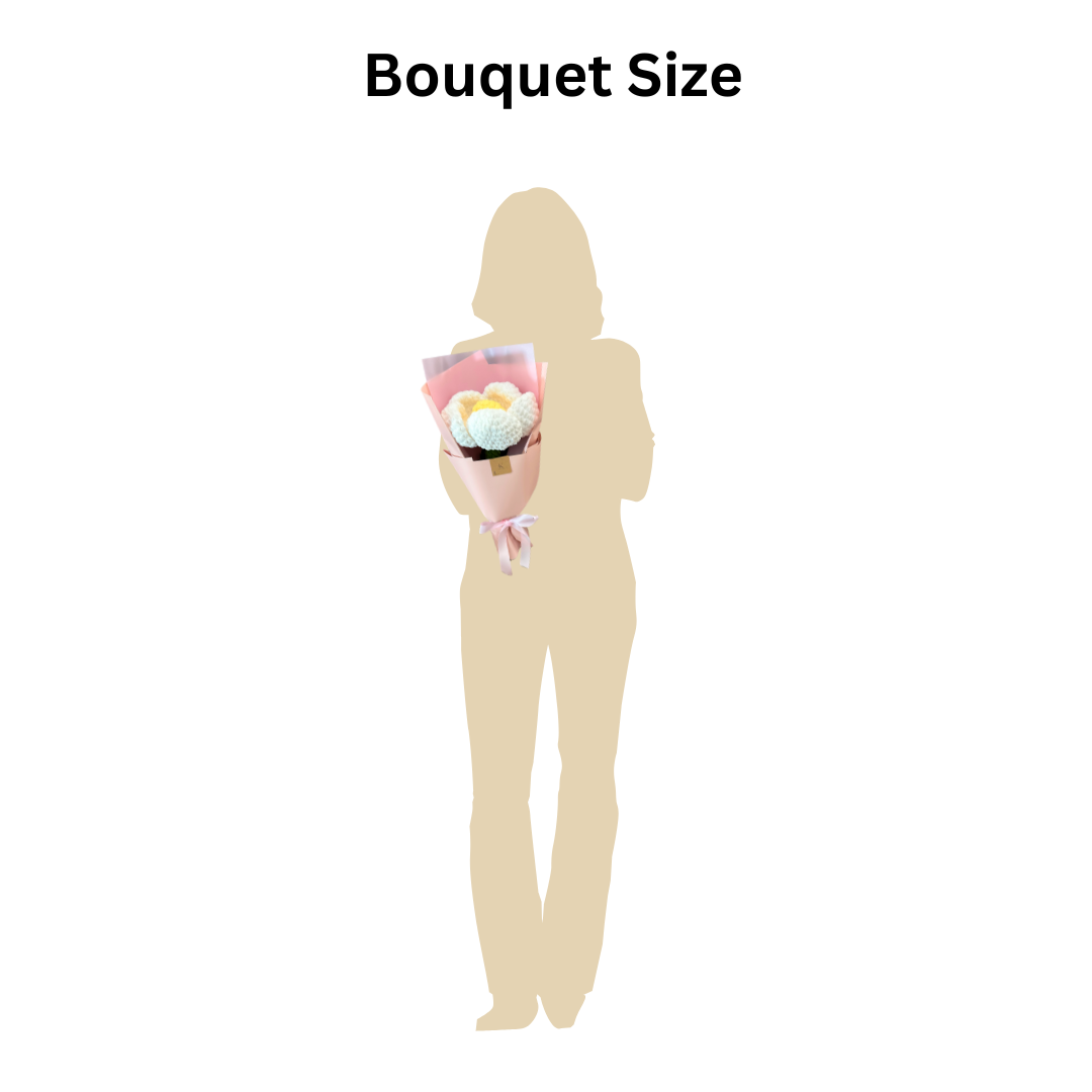 The Gia Crochet Bouquet features giant crochet flowers in white and yellow, beautifully wrapped in vintage eco- paper, offering a stunning and whimsical floral arrangement.
