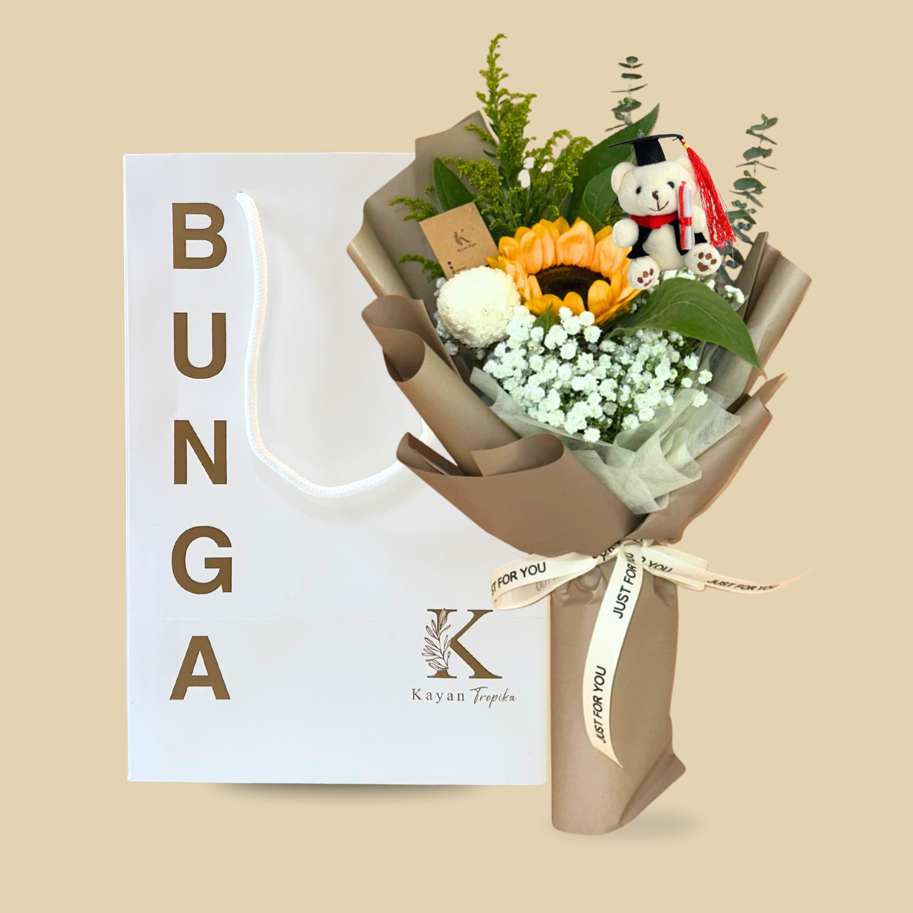Sunflower (1 Stem), White Ping Pong (1 Stem), Baby Breath (2 Stalks), Foliages, Mini Graduation Bear 1