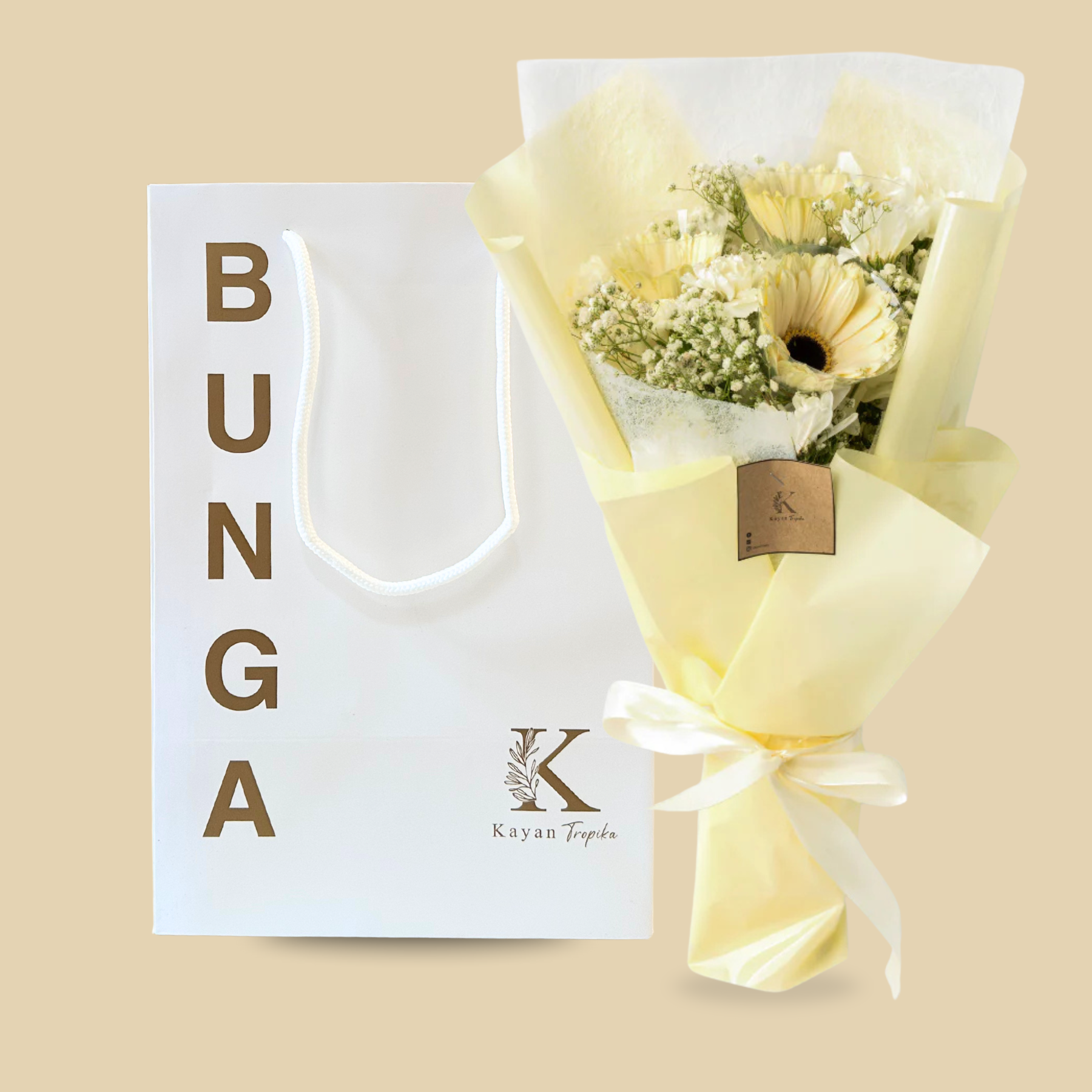 Helen Bouquet radiates purity and warmth with a delightful mix of White Pom Pom and Light Yellow Gerbera, accented by delicate White Baby's Breath. Wrapped in soft light yellow paper, this bouquet exudes a gentle charm, perfect for brightening someone's day with its sunny hues.