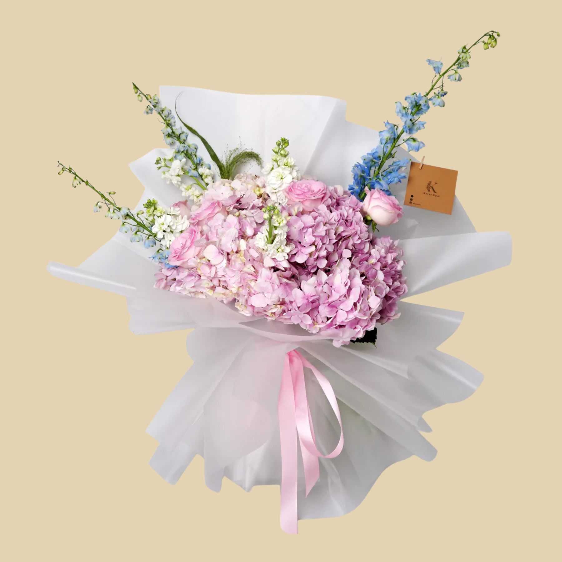 Hydrangea (2 Stems), Rose Pink (5 Stems), Matthiola (4 Stems), Delphinium (3 Stems)