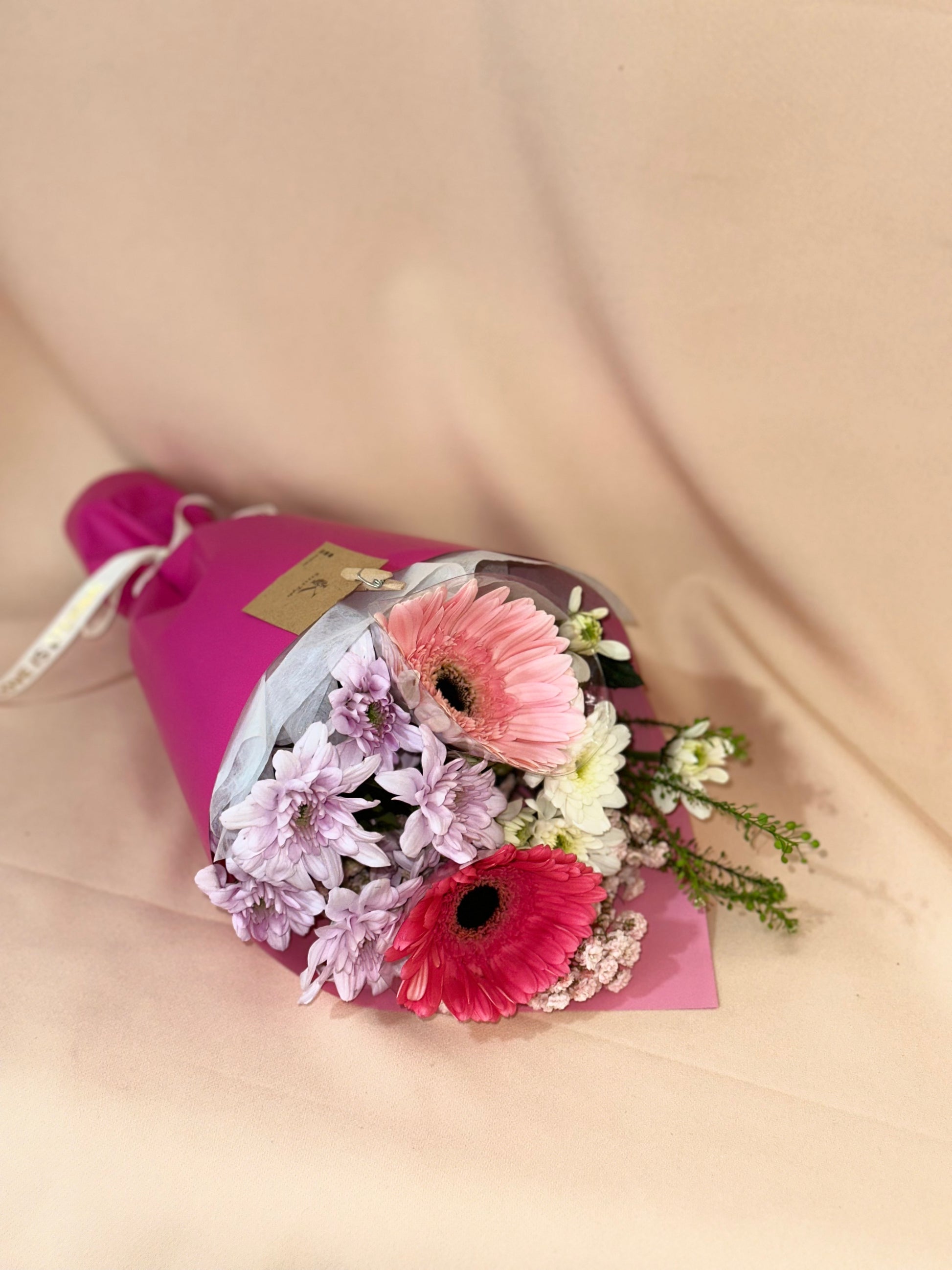 Light Pink Pom Pom (1 Stalk), Hot Pink Gerbera (1 Stem), Light Pink Gerbera (1 Stem), Light Pink Baby Breath (1 Stem).