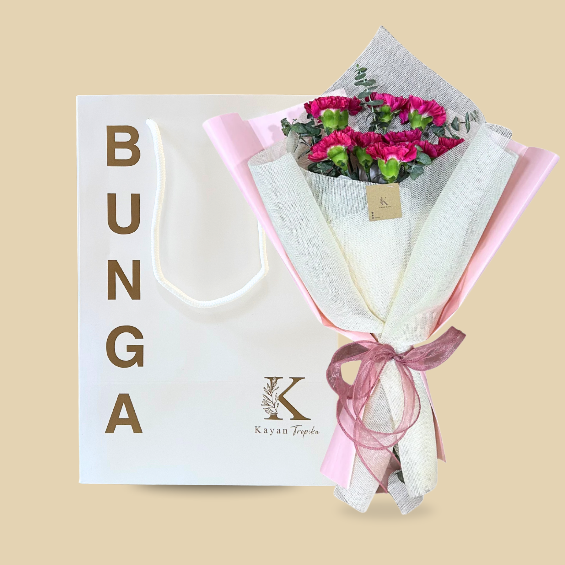 Presenting the Marguerite Bouquet—a striking arrangement of ten vibrant hot pink carnations, beautifully complemented by lush eucalyptus foliage. Wrapped in elegant woven material, this bouquet exudes charm and sophistication, making it a perfect gift for any occasion or a delightful addition to your own space. Celebrate the beauty of simplicity with Marguerite!