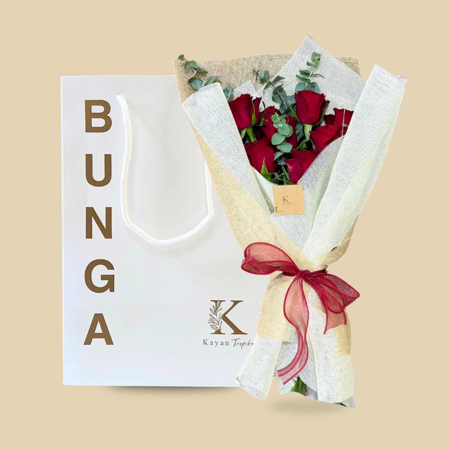 Introducing the Ophelia Bouquet—a timeless arrangement featuring ten stunning red roses, beautifully paired with fragrant eucalyptus foliage. Wrapped in rustic woven material, this bouquet evokes warmth and natural charm, making it a perfect expression of love and affection. Whether for a special occasion or a heartfelt gesture, Ophelia brings elegance and beauty to any setting.