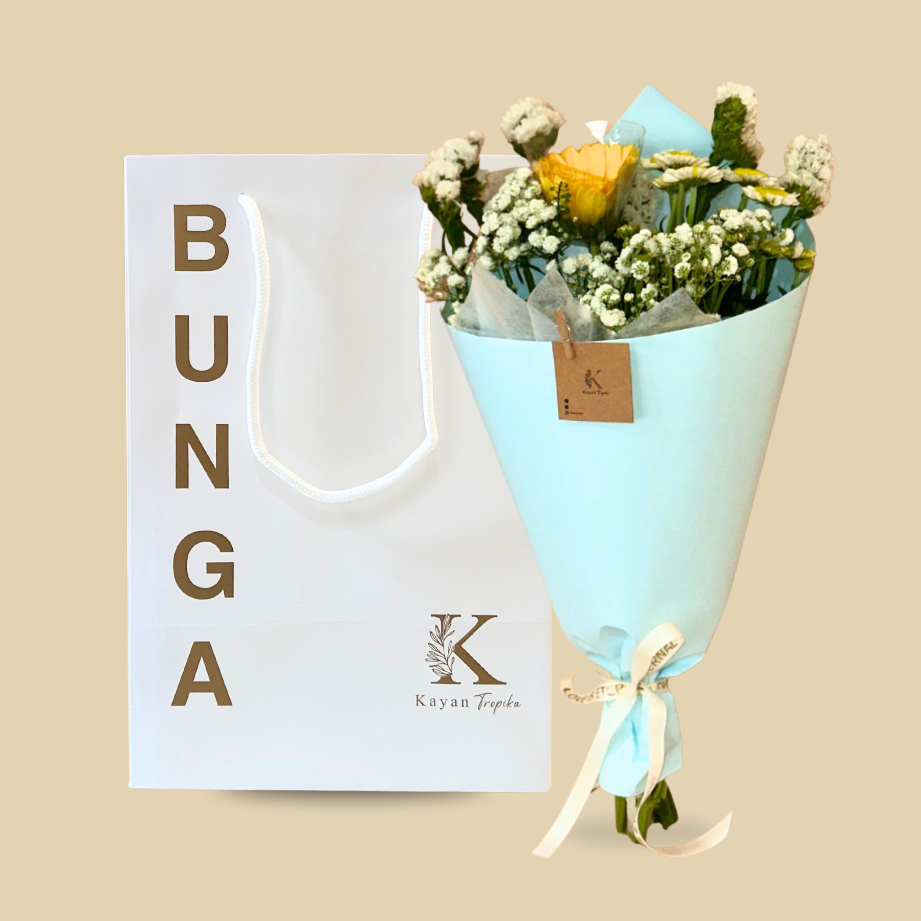 Sunflower Pom Pom (1 Stalk), White Statice (1 Stalk), Yellow Gerbera (1 Stalk), White Baby Breath (1 Stalk).