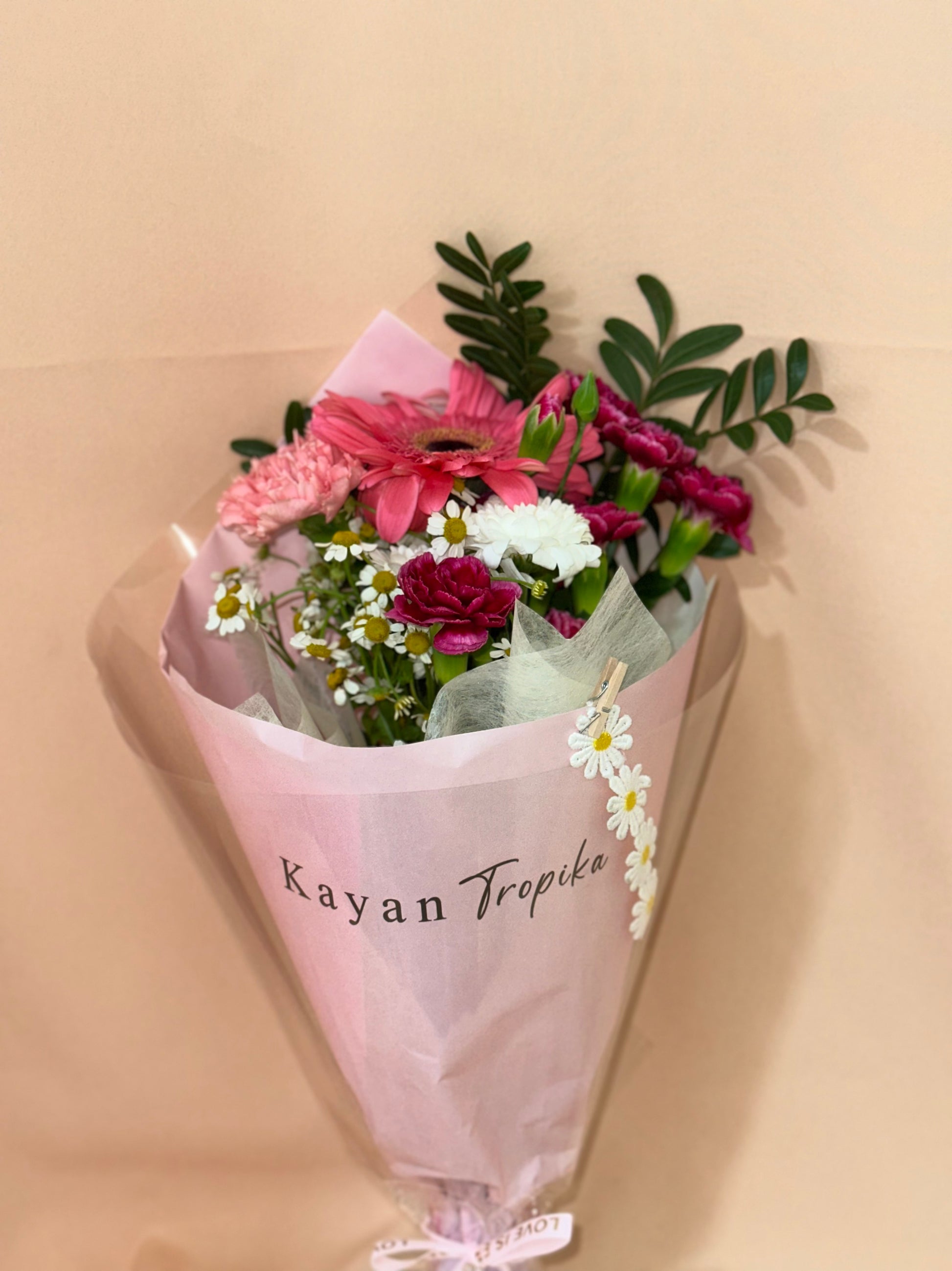 White Pom Pom (1 Stalk), Pink Gerbera (1 Stem), Pink Carnation (2 Stems),Purple Carnation (2 Stems), Chamomile ( 1 Stalk), Foliages