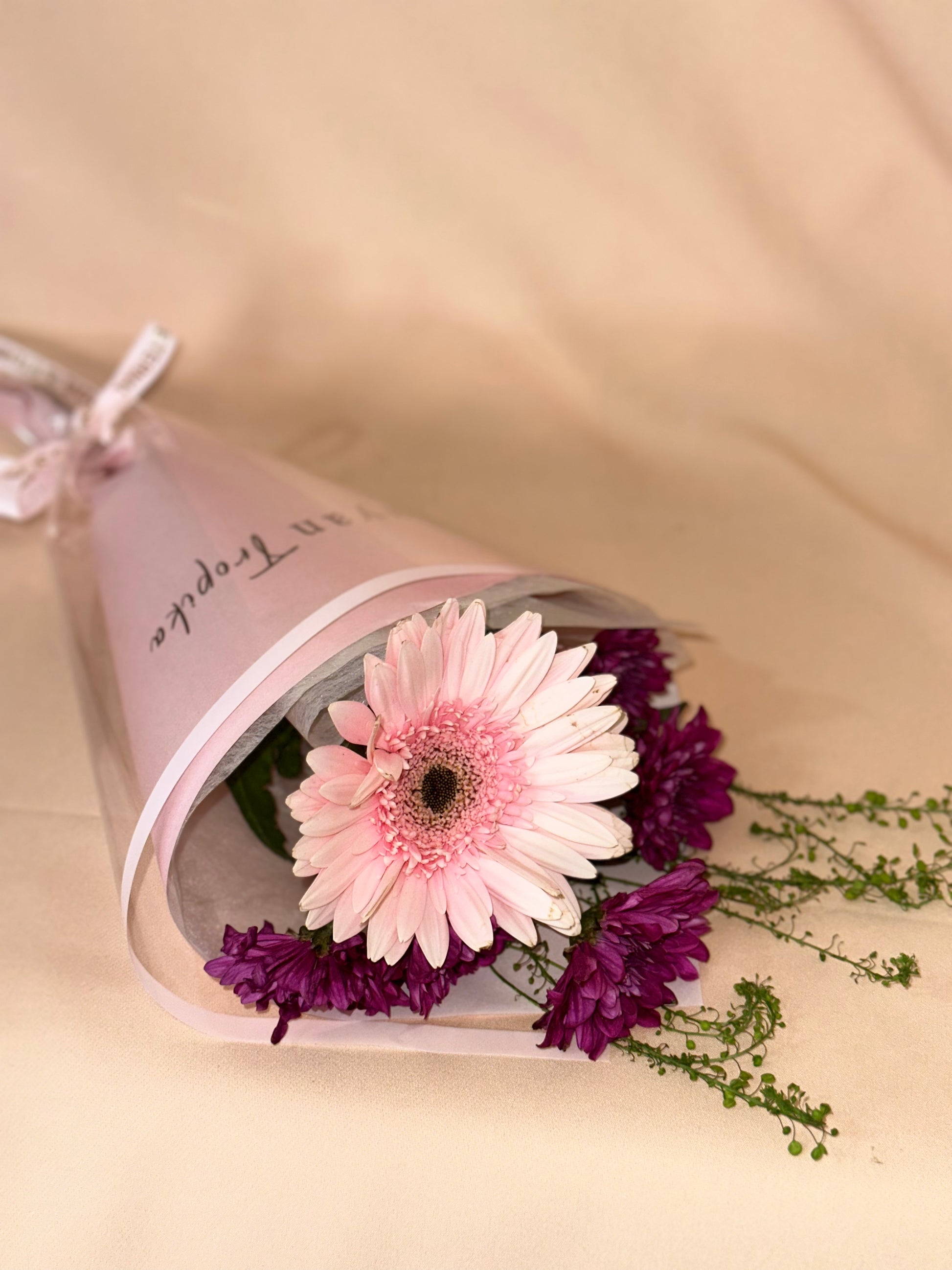 Pink Gerbera (1 Stem), Dark Purple Pom Pom (1 Stalk)