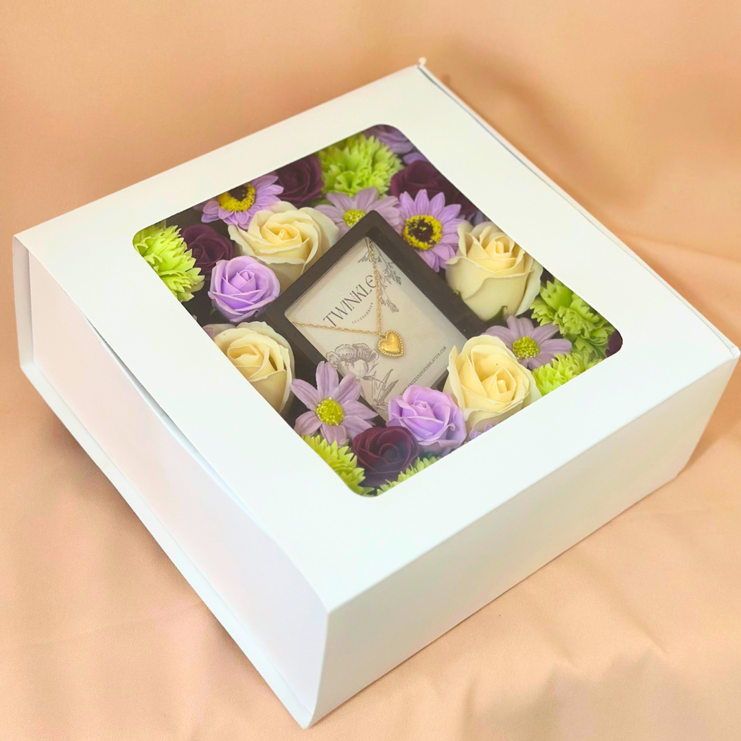 The Blooming Glam is the perfect fusion of elegance and luxury, featuring a stunning Soap Flower. Paired with a carefully selected accessory by Twinkle that’s waterproof, rust-free, and hypoallergenic, this gift box offers lasting beauty and style. A chic and thoughtful way to treat someone special.