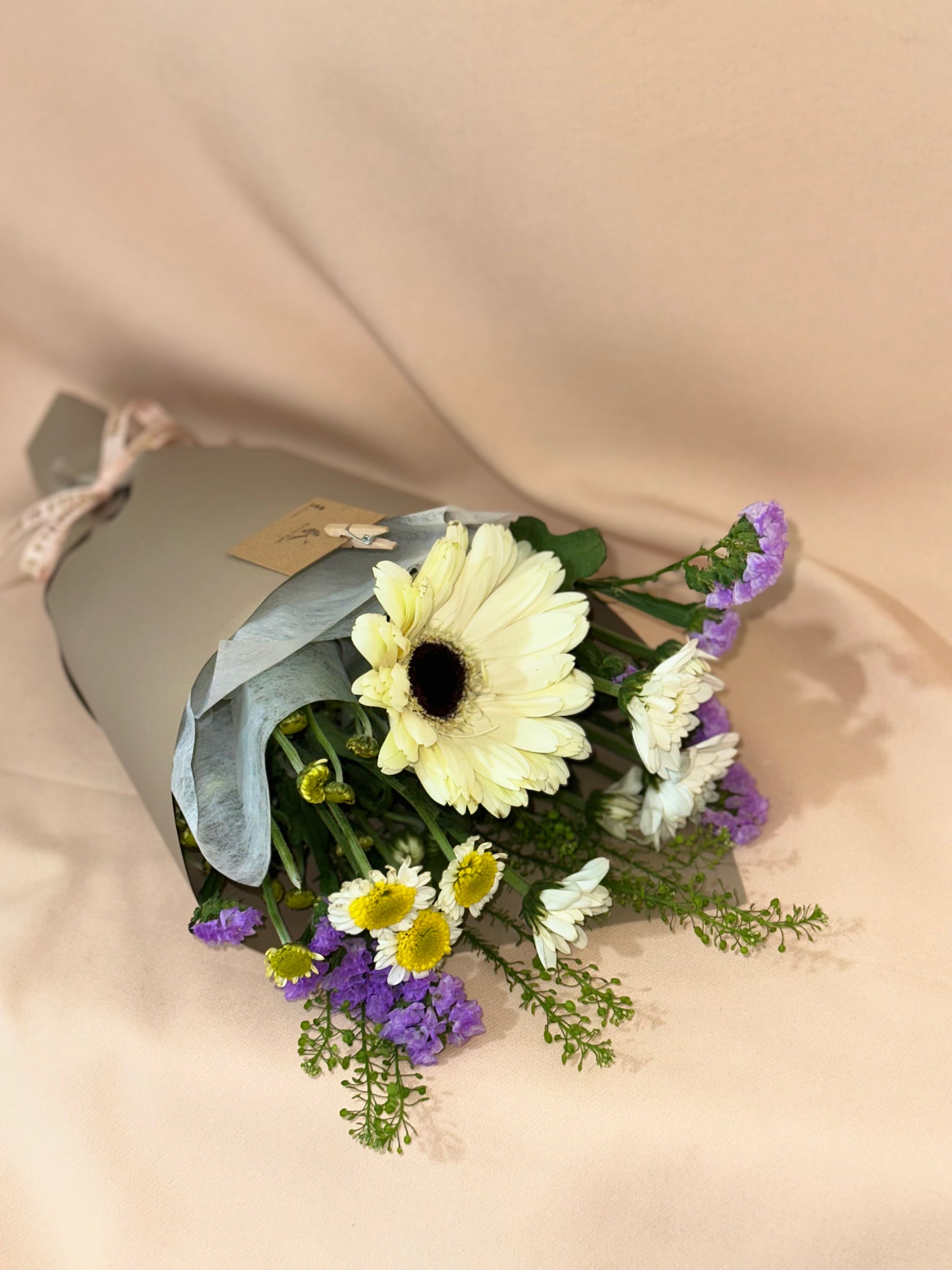 White Gerbera (1 Stem), Sunflower Pom Pom (1 Stalk), Purple Statice (1 Stalk), White Pom Pom (1 Stem)