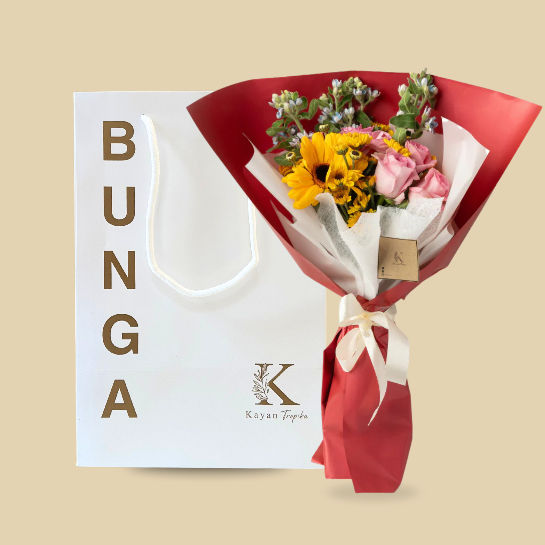 Bouquet Valerie radiates warmth and vibrancy with a delightful mix of Pink Rose, Sunflower Pom Pom, Yellow Gerbera, and lush foliage, elegantly wrapped in bold red paper. This arrangement blends the beauty of roses with the cheerfulness of sunflowers, making it a perfect gift to convey joy and affection on any occasion.
