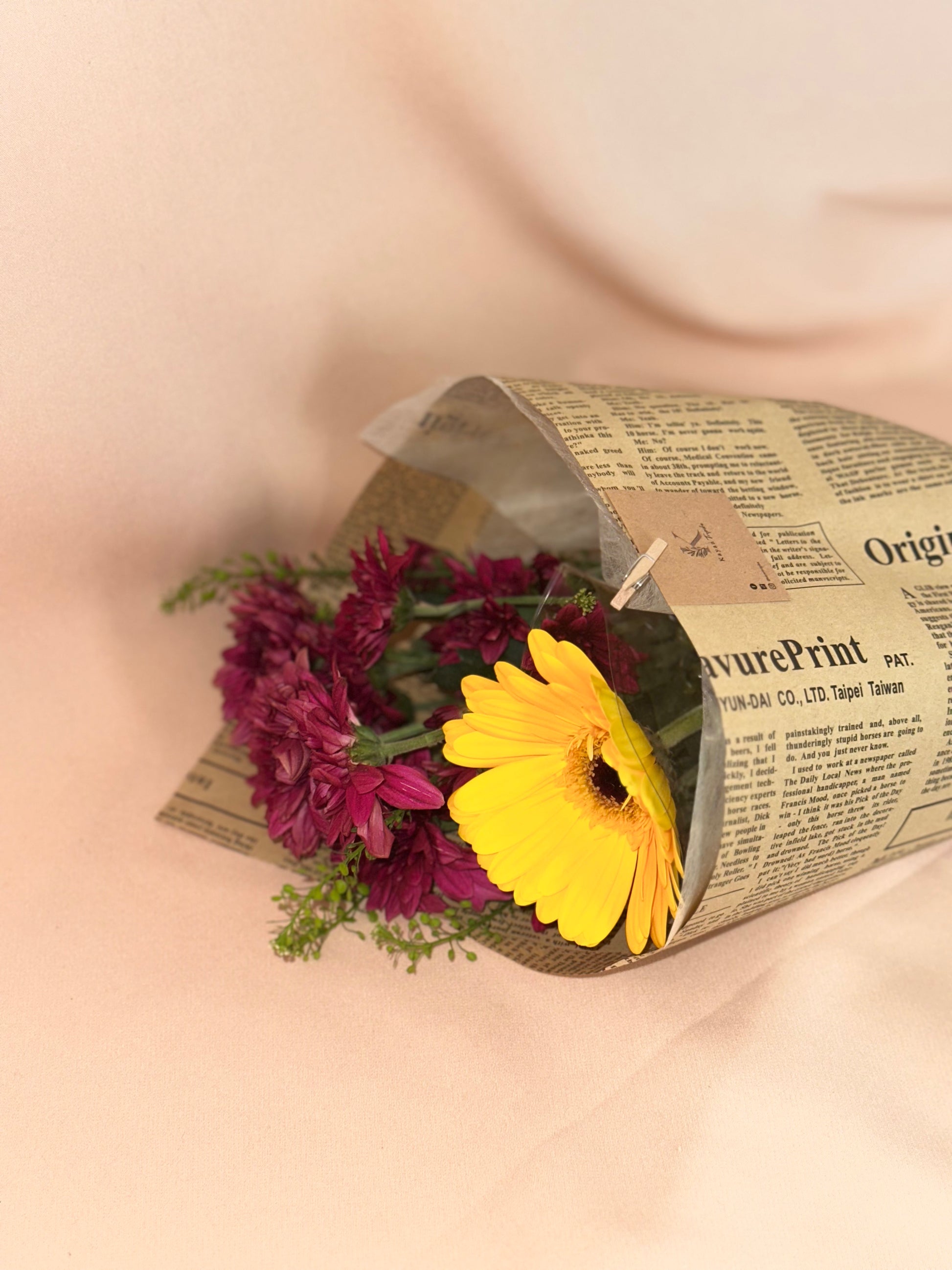 The Willy Bouquet is a strikingly simple yet vibrant arrangement that captures attention with its bold colors. At the center, a cheerful yellow gerbera radiates warmth and happiness, symbolizing friendship and positivity. Complementing this bright focal point is a rich maroon pom pom, which adds depth and sophistication, creating a beautiful contrast that draws the eye. Together, these two blooms create a harmonious balance that is perfect for any occasion, whether itās to celebrate a special moment or to brighten someoneās day. The Willy Bouquet embodies a joyful spirit and is sure to bring smiles wherever it goes.