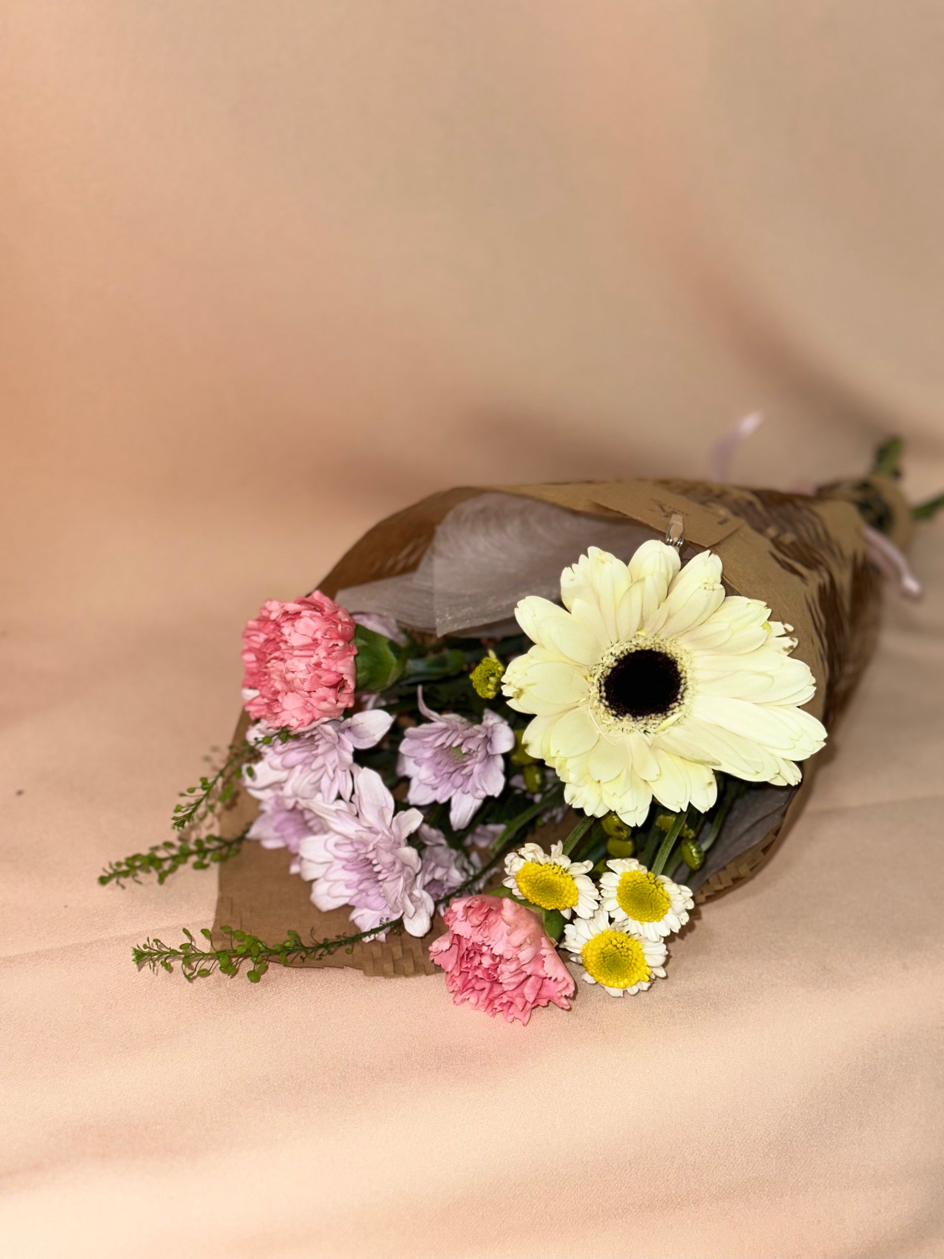 Sunflower Pom Pom (1 Stalk), Light Pink Pom Pom (1 Stalk), White Gerbera (1 Stem), Pink Carnation(1-2 Stems).